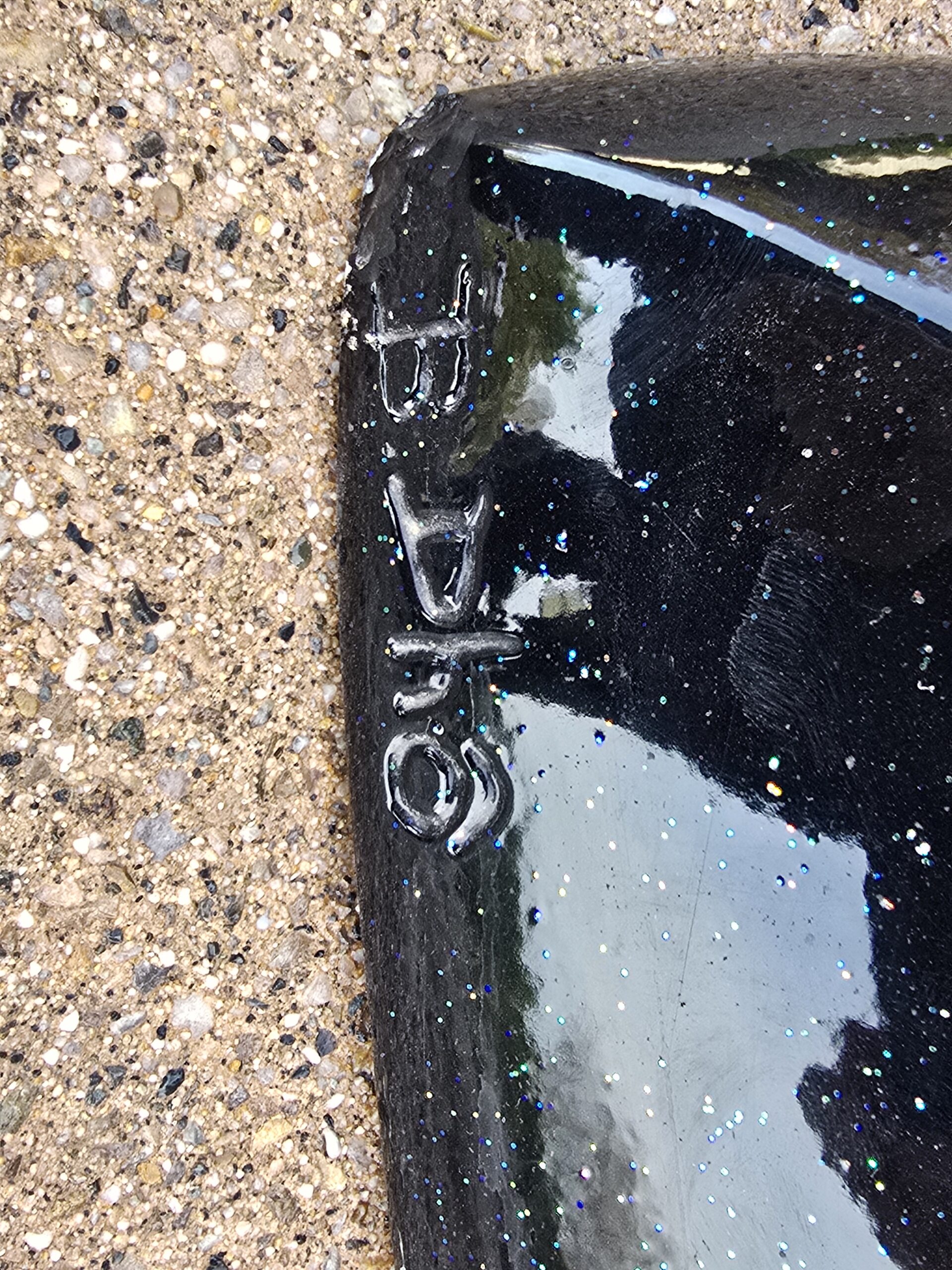 Teintée noir à reflets pailletés.